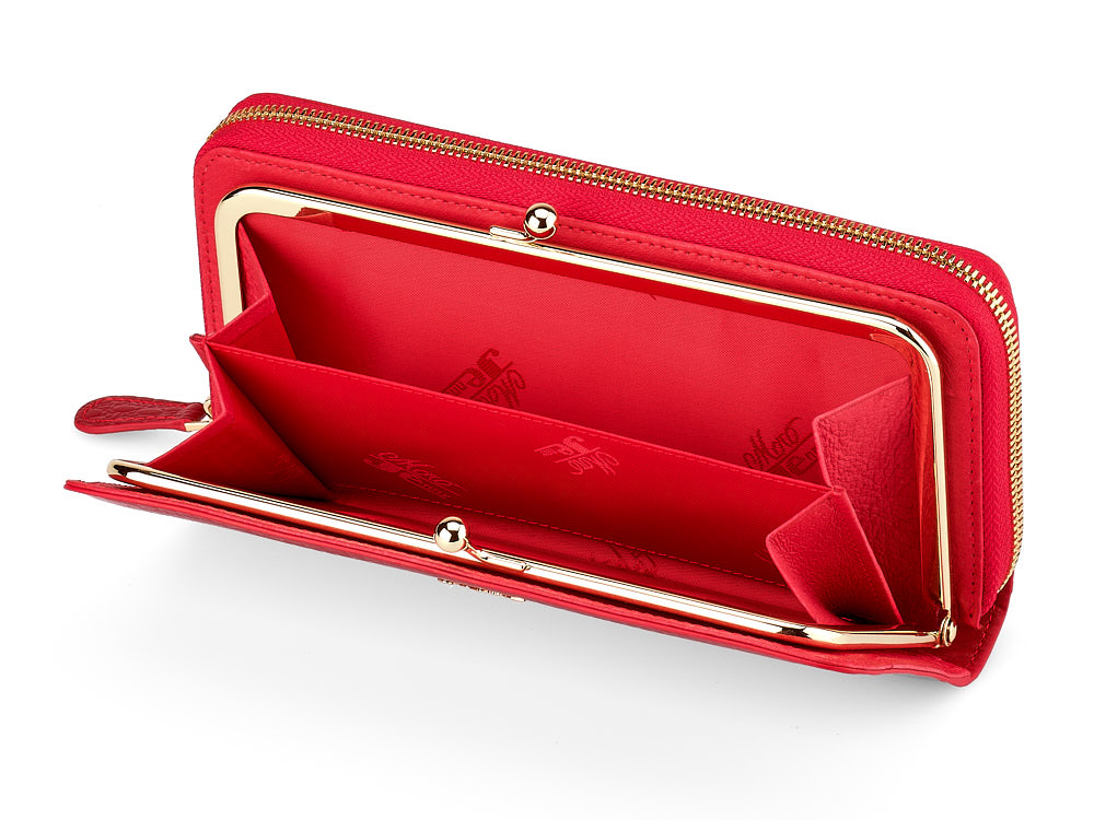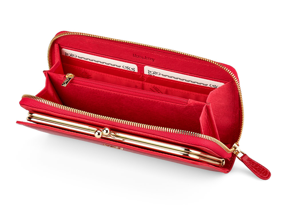 Благодаря внешнему покрытию лаком, кошелек замечательно носится и сохраняет свое первоначальное состояние. Имеет два больших отделения, одно из которых закрывается на "поцелуйчики", второе – с помощью молнии. Внутри второго отделения есть карманы для кредитных/визитных карт, а также монетница. Кошелек очень вместительный и запоминающийся своим нестандартным исполнением.