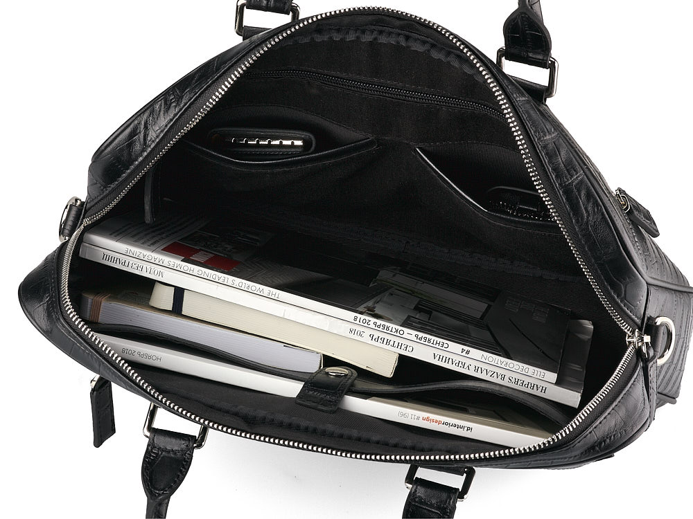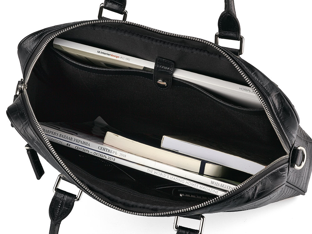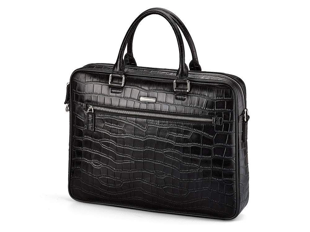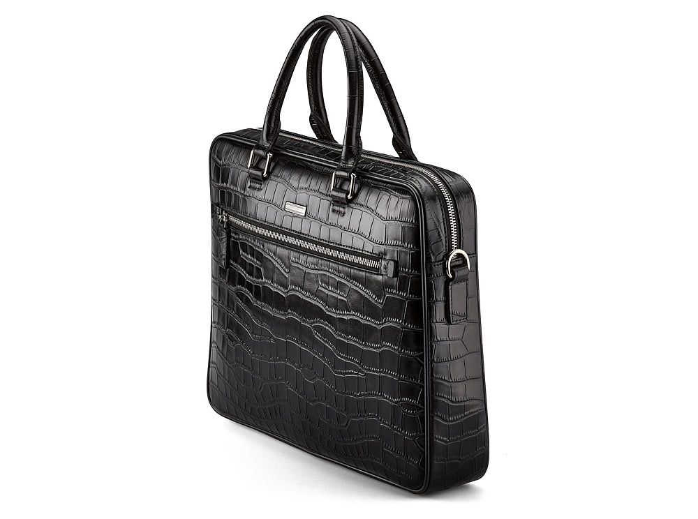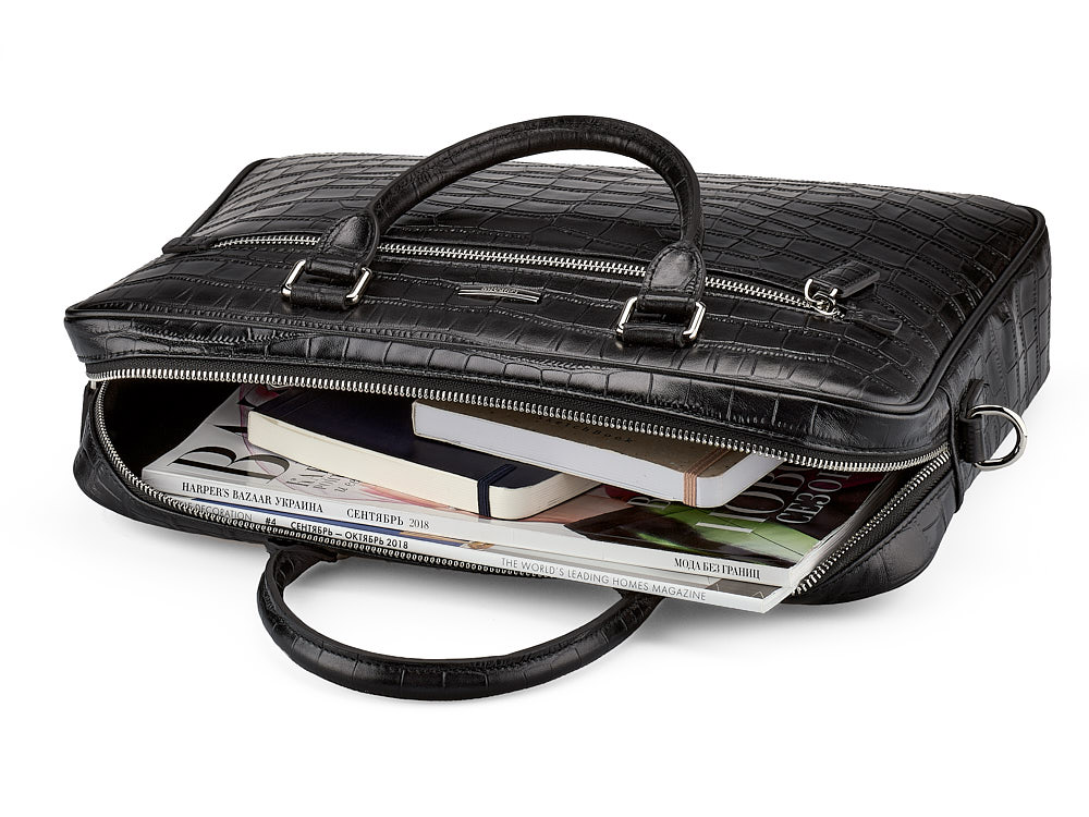 Эта сумка создана для тех, кто ценит изысканный дизайн и функциональность. Изготовленная из натуральной кожи высшего сорта с тиснением под крокодила, она обеспечивает долговечность и приятные тактильные ощущения. Сумка имеет одно основное отделение для бумаг, карман для ноутбука и дополнительные отделения на молнии, что позволяет удобно организовать ваши вещи. Компактные размеры позволяют легко разместить сумку в руке или на плече, сохраняя ваш стиль в любой ситуации.