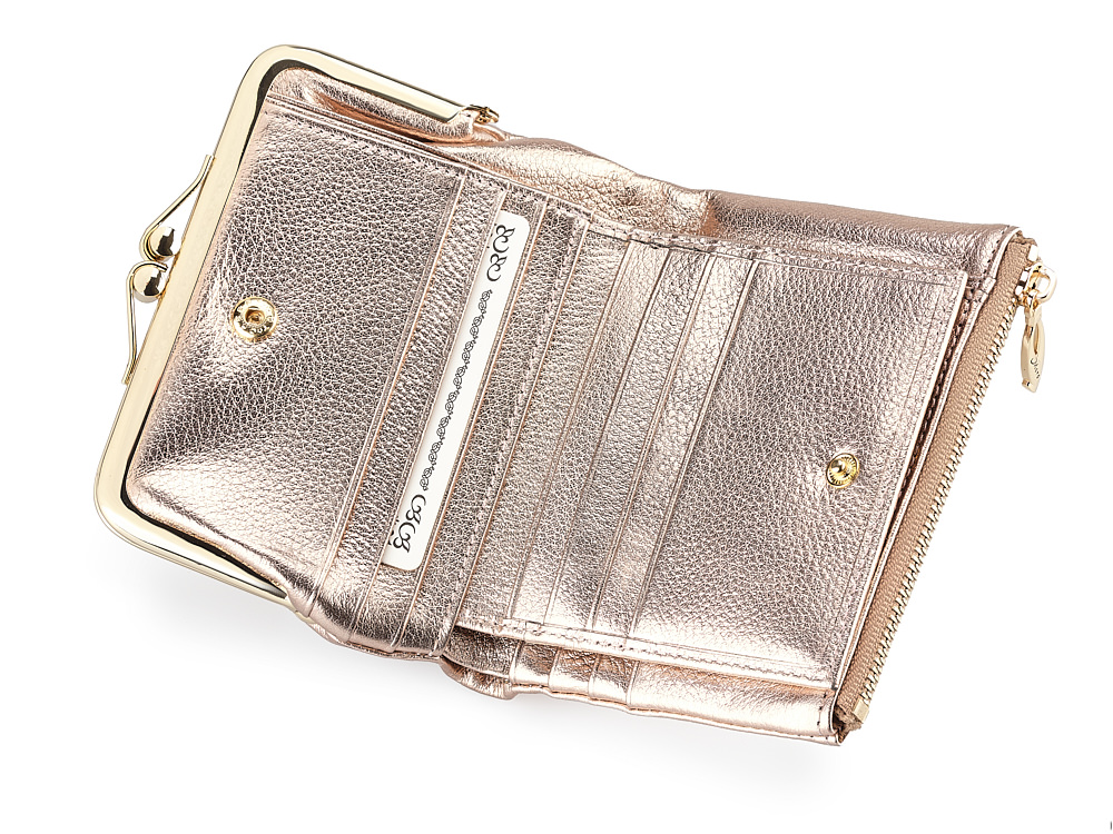 Внутри кошелька расположено два отделения под купюры, большое количество ячеек под карточки, и отдельная монетница с металлическим фермуаром.