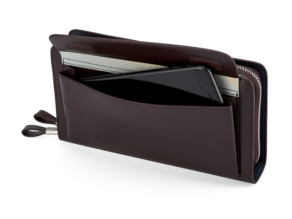 Этот клатч изготовлен из высококачественной натуральной кожи благородного коричневого цвета, что придает ему элегантный вид и обеспечивает долговечность. Модель оснащена двумя основными отделениями и внешним накладным карманом для телефона, что позволяет удобно разместить все необходимые вещи. Крепление на руку расположено сзади изделия, обеспечивая комфортное ношение. Вся используемая фурнитура – надежная и долговечная.