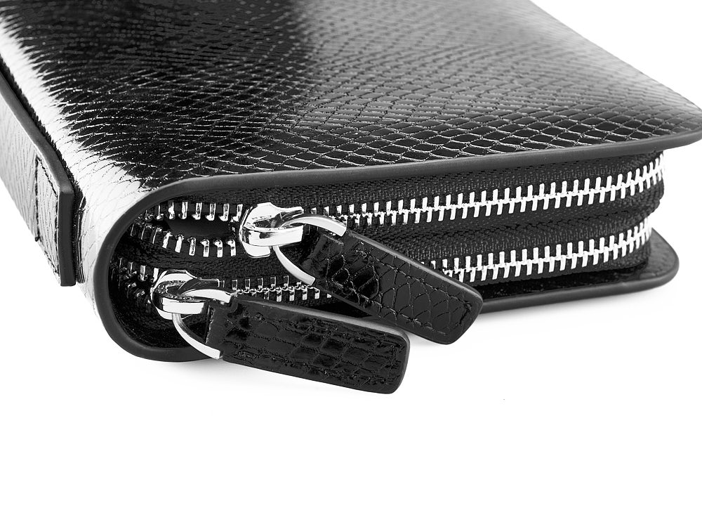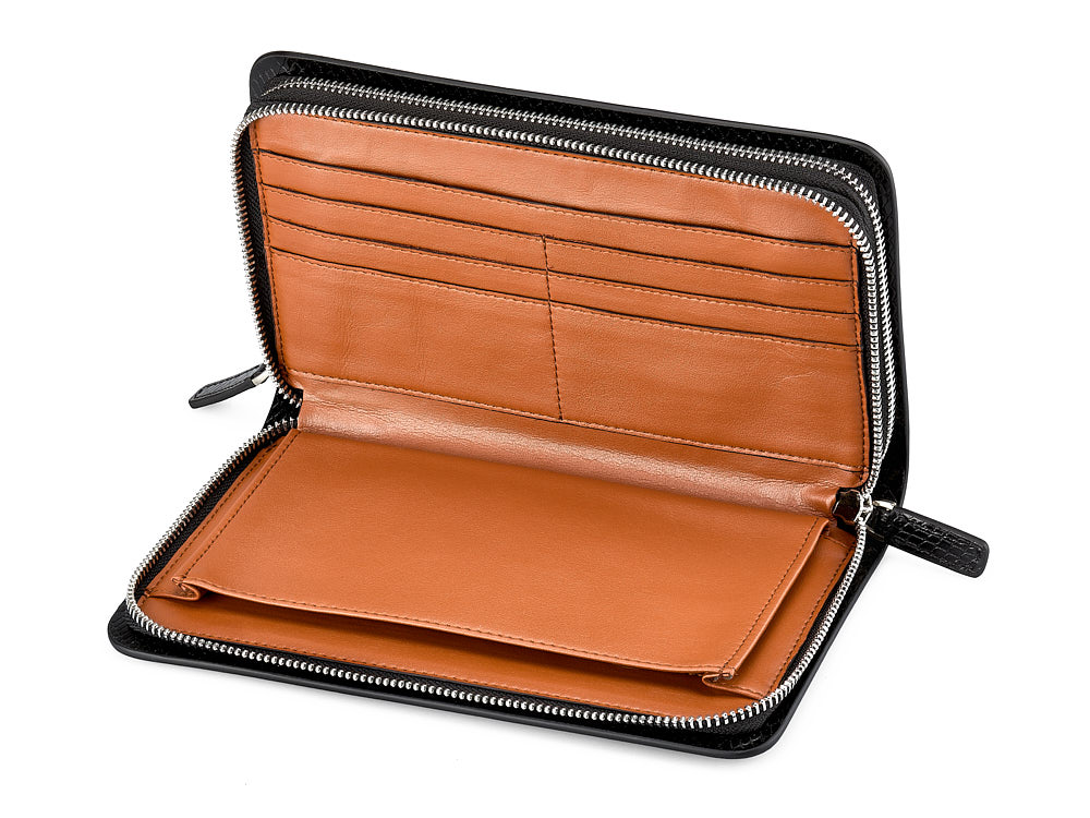 - Вместительный дизайн: Два основных отделения, дополнительные карманы для купюр, карт и монет, что позволяет удобно хранить все необходимые вещи.