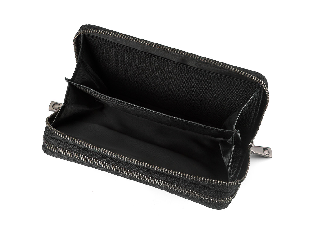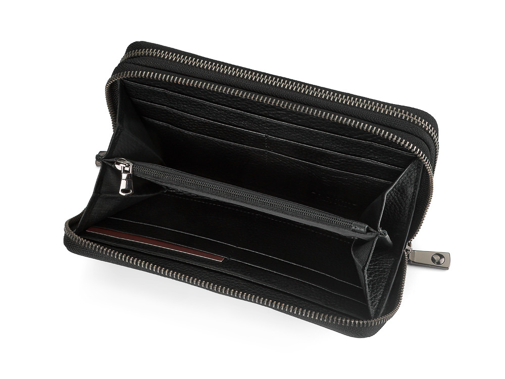 Два основных отделения на молнии позволяют разделить содержимое и поддерживать порядок. Внутри предусмотрено шесть секций для купюр, карманы для банковских карт и отдельное отделение для монет. Горизонтальный формат рассчитан под ровную купюру, поэтому деньги и документы не мнутся.