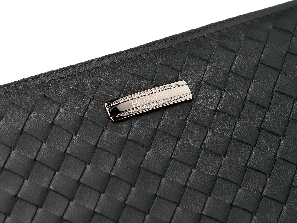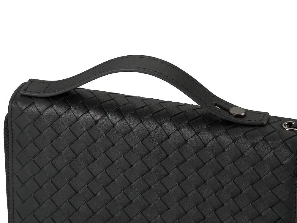 Этот мужской клатч подойдёт тем, кто предпочитает держать всё необходимое в одном месте. Он выполнен из натуральной кожи с плетёной фактурой. Такая поверхность выглядит выразительно и практична в повседневном использовании. Клатч удобно лежит в руке, а съёмный ремешок на запястье делает ношение ещё комфортнее.