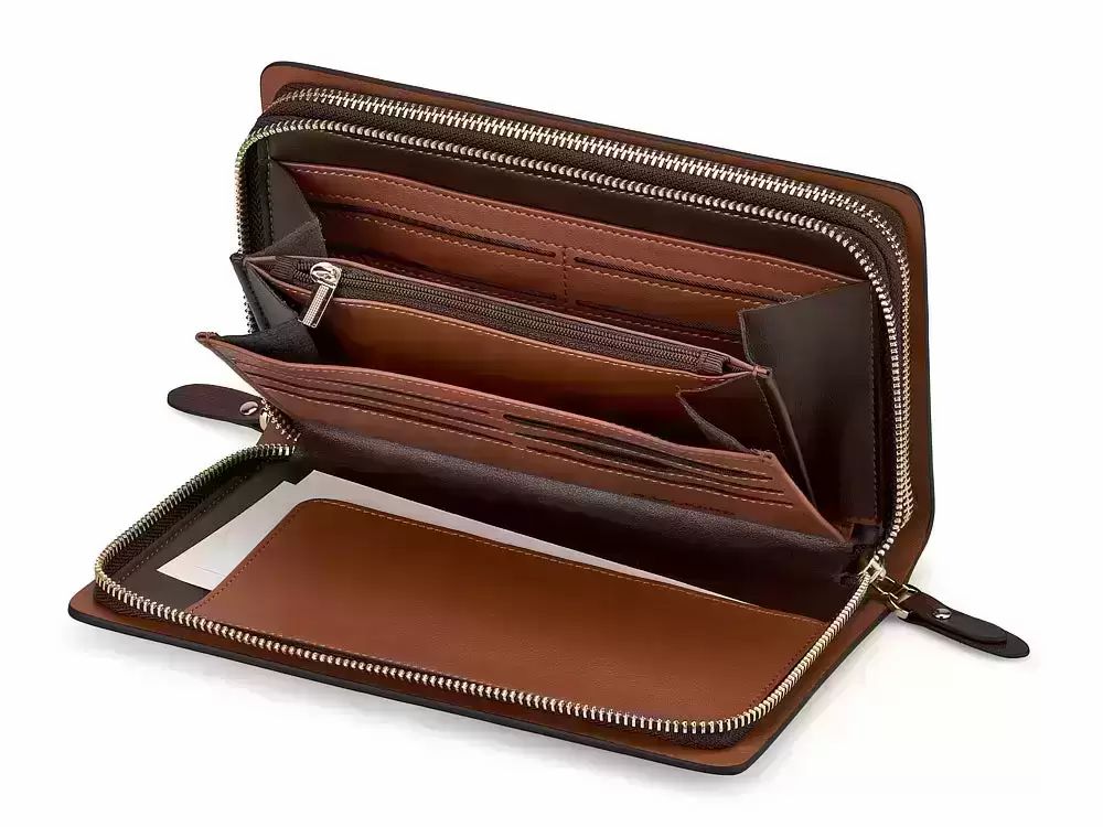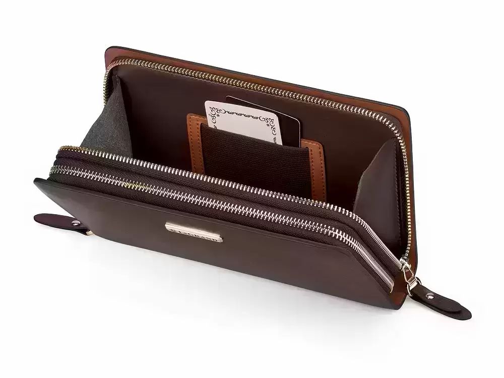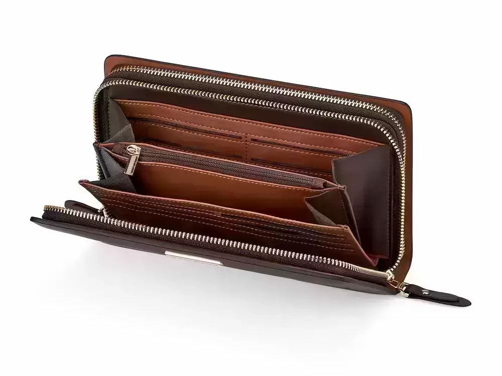- Вместительный дизайн: Два основных отделения, одно из которых полностью открывается, дополнительные отделения для купюр, кредитных карт и монет позволяют удобно хранить все необходимые вещи.