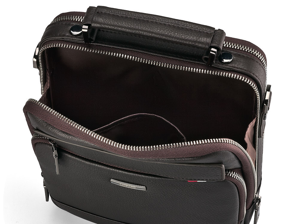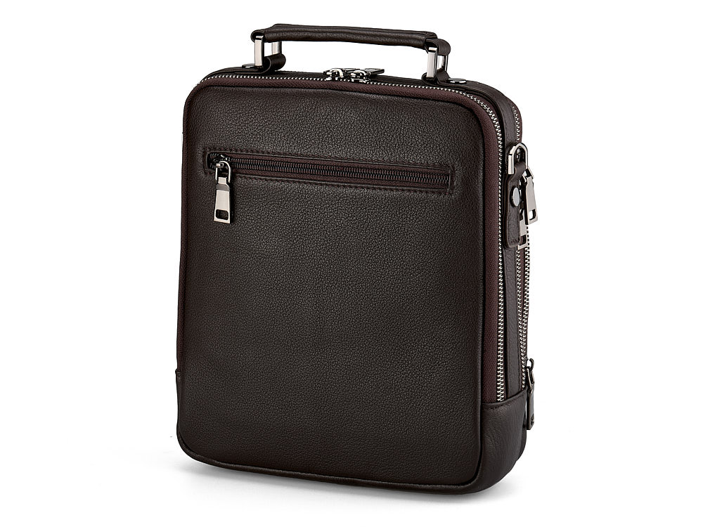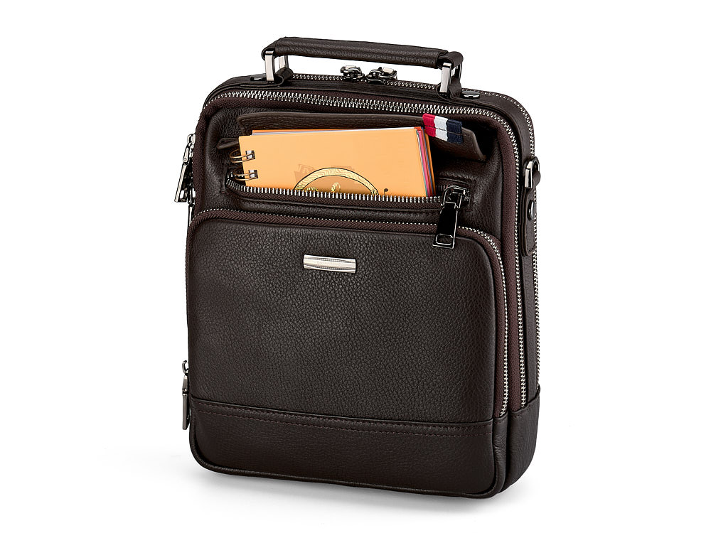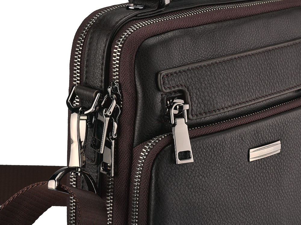 Ця сумка створена для чоловіків, які цінують вишуканий дизайн та функціональність. Виготовлена з високоякісної натуральної шкіри з тисненням, вона забезпечує довговічність та приємні тактильні відчуття. В основі сумки – металевий каркас, на якому скоби тримають ручку, що додає конструкції міцності. Всередині та зовні передбачено багато відділень і кишень, які для зручності користування закриваються на блискавку. У комплекті йде плечовий ремінь з надійними карабінами, що забезпечує комфортне носіння.
