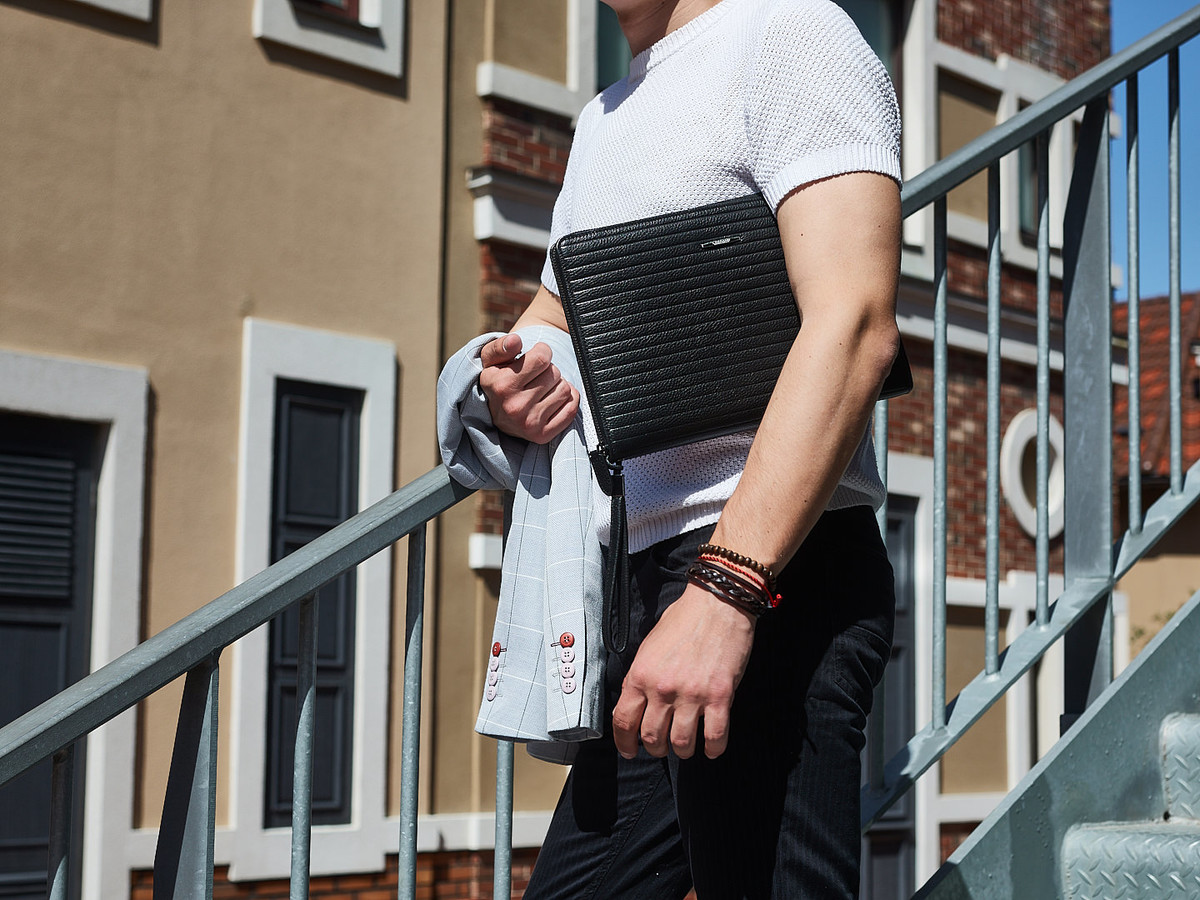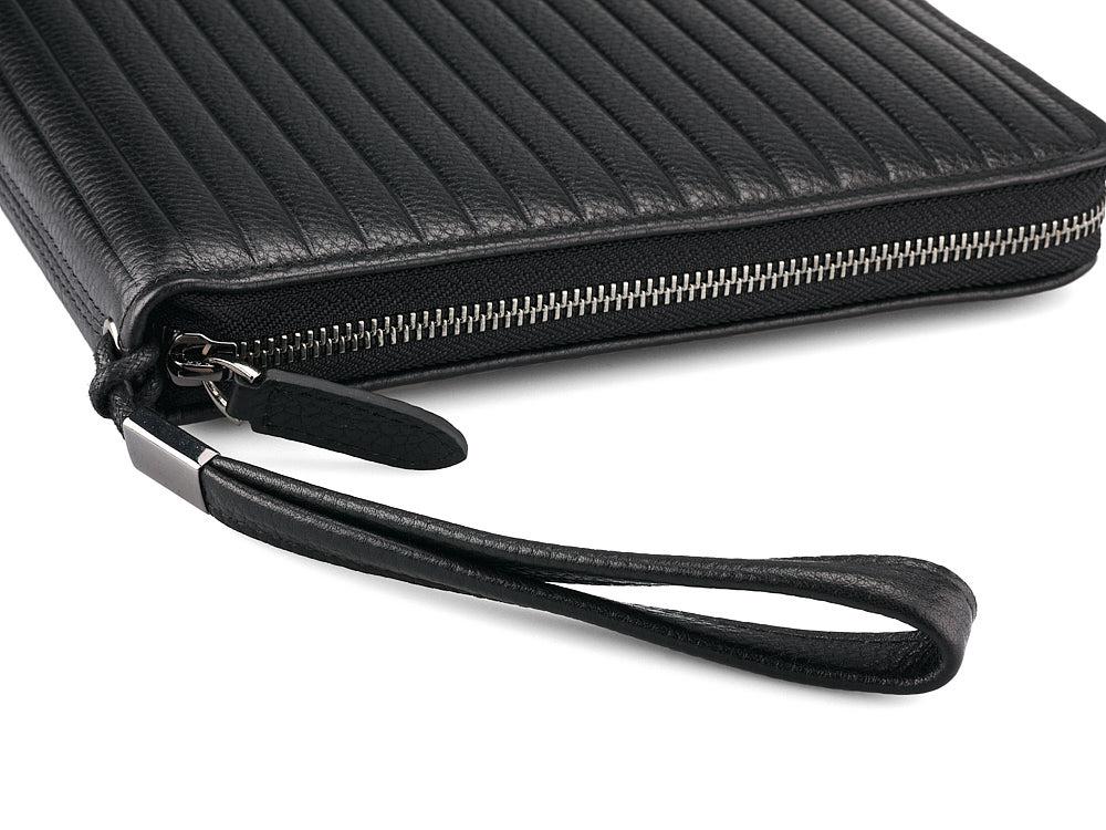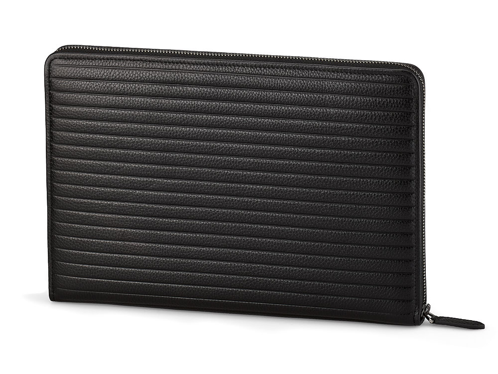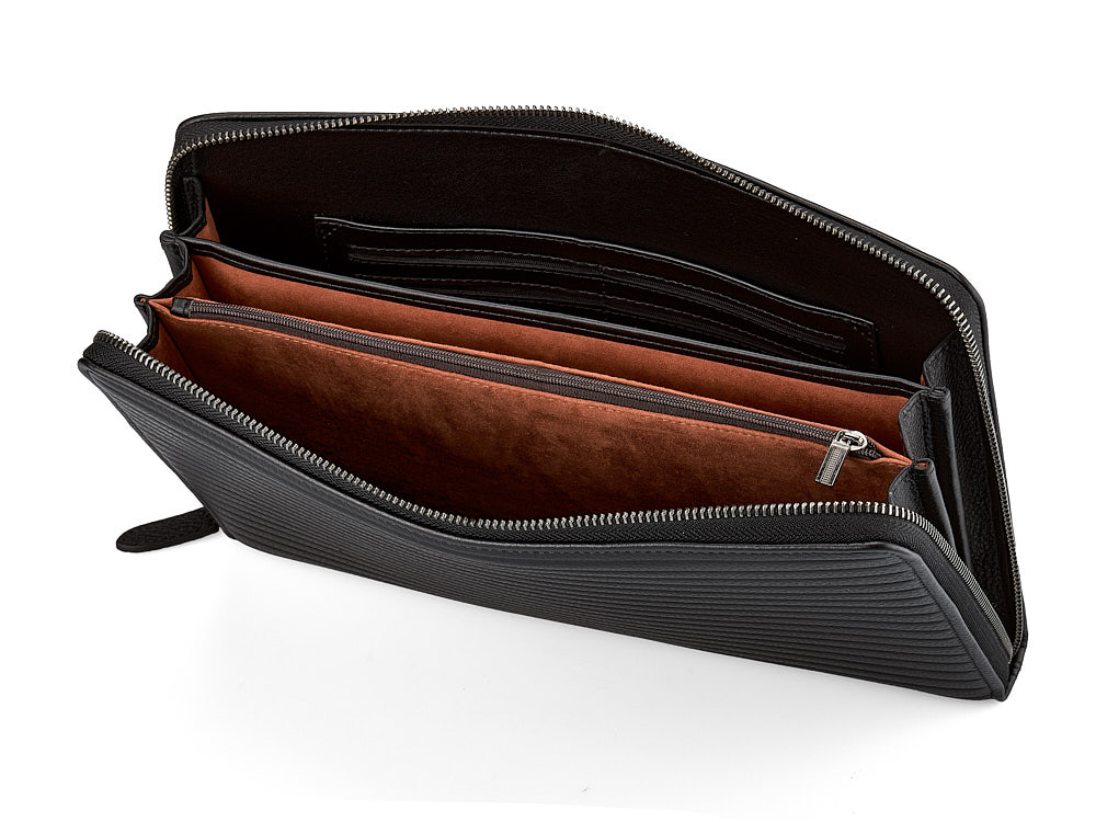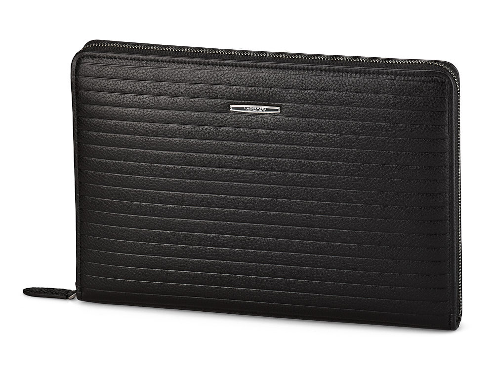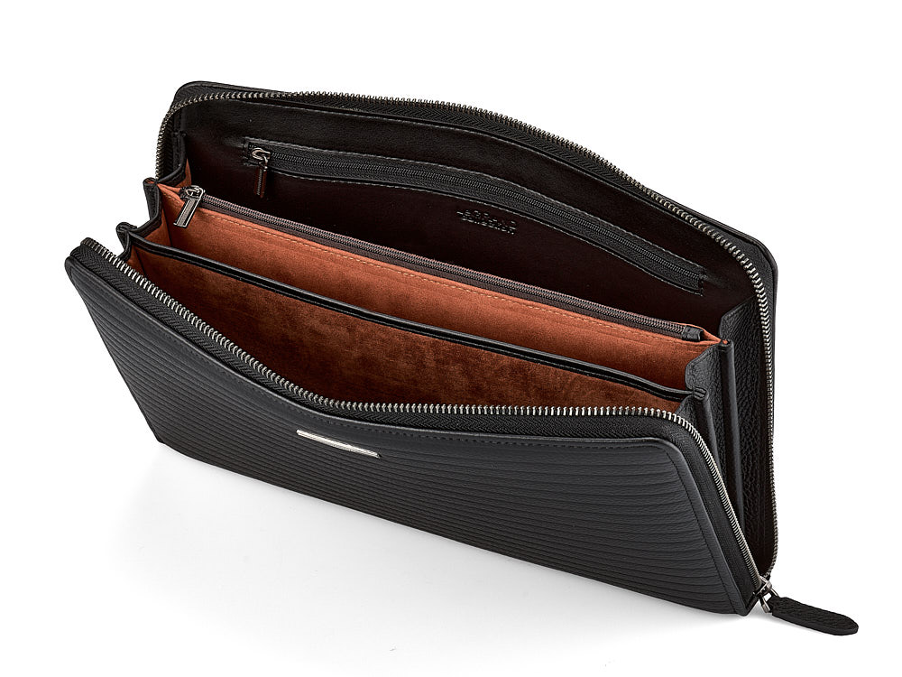 Ця папка підходить для зберігання iPad, блокнота або документів формату А5. Виготовлена з високоякісної шкіри, стійкої до подряпин, що забезпечує довговічність і бездоганний зовнішній вигляд. Дизайн передбачає три просторі відділення та дві кишені на блискавці для надійного зберігання речей. З'ємна ручка-петля додає зручності, а полірована фурнітура підкреслює вишуканість виробу.