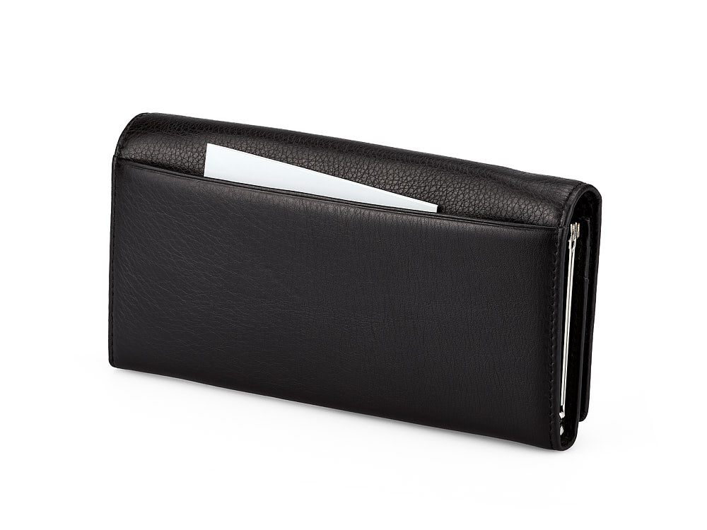 Внутрішній простір продумано до дрібниць: три відділення для купюр дозволяють зручно розмістити банкноти, а металева монетниця забезпечує надійне зберігання дрібниць. Додаткові кишені призначені для кредитних та візитних карток, а також є потайна кишеня на блискавці для особливо цінних предметів. Застібка на кнопку гарантує надійне закриття та збереження вмісту.