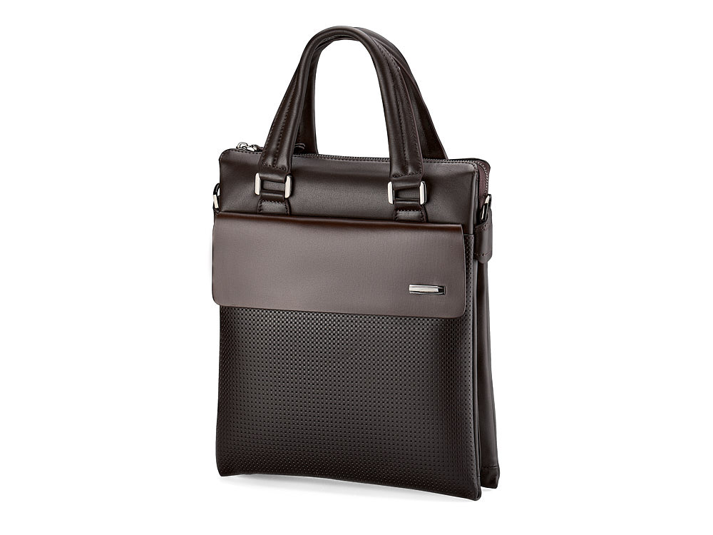 Уявіть собі елегантний аксесуар, що ідеально поєднує вишукану красу та повсякденну зручність: ця вертикальна чоловіча сумка з натуральної шкіри зачарує вас своїм дизайном та функціональністю. Створена для документів формату A4, вона оснащена двома зручними ручками та регульованим плечовим ременем на міцних карабінах, що робить її незамінною для ділових зустрічей, подорожей чи щоденних справ. Поєднання перфорованої та гладкої шкіри додає унікальної текстури та елегантності, а якісна фурнітура забезпечує надійність та комфорт. Плечовий ремінь із шовкової нитки м’яко прилягає до одягу, не залишаючи слідів та не створюючи незручностей.
