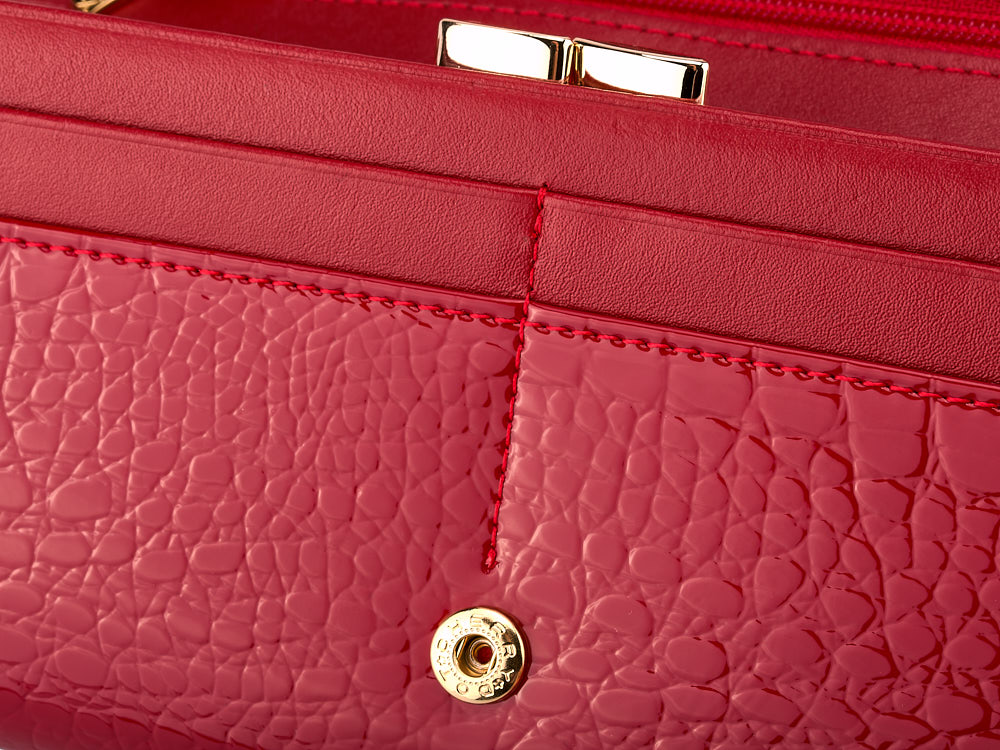 Этот классический женский кошелек изготовлен из высококачественной натуральной кожи с лаковым покрытием, что придает ему элегантный вид и обеспечивает долговечность. Внутренняя часть также отделана кожей, что подчеркивает внимание к деталям и высокое качество исполнения. Кошелек оснащен тремя отделениями для купюр и металлической монетницей внутри, что обеспечивает удобное хранение всех необходимых вещей. Компактные размеры позволяют легко носить кошелек как в сумке, так и отдельно.