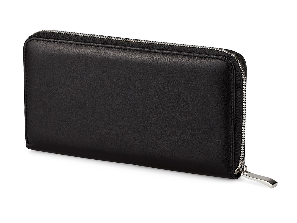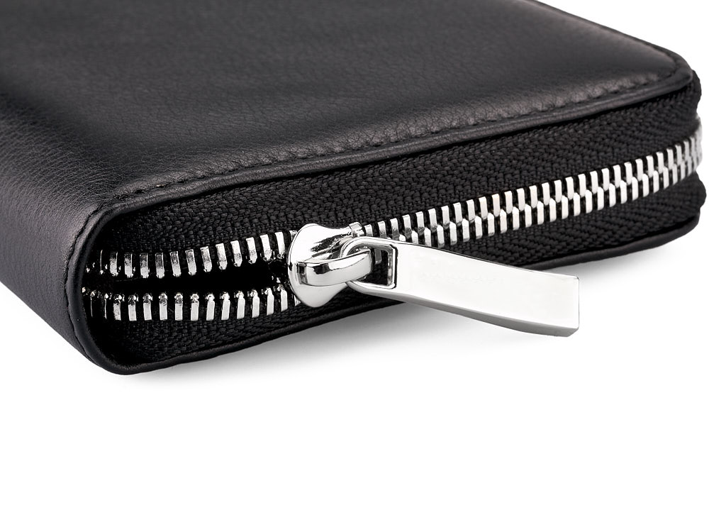 Внутреннее пространство организовано для максимального удобства: три отделения для купюр позволяют хранить банкноты разного номинала, а отделение на молнии предназначено для монет. По бокам расположены карманы для кредитных и визитных карт, обеспечивая быстрый доступ к ним. Надежная полированная фурнитура добавляет изысканности и долговечности изделию.